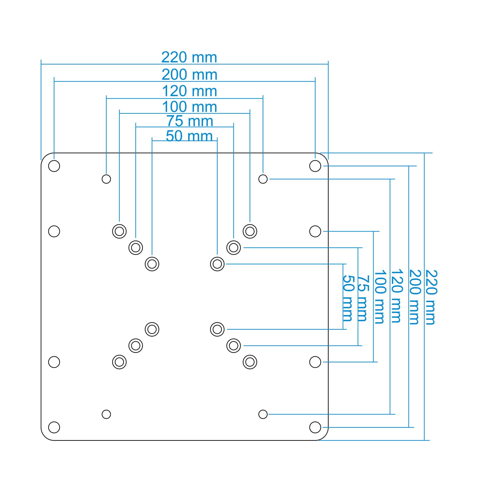 TooQ VMA0200-B. Tipo di prodotto: Piastra per dispositivo, Panel mounting interface 24/5000 Interfaccia per montaggio a pannello: 50 x 50,75 x 75,100 x 100,100 x 200,200 x 100,200 x 200, Capienza minima dimensioni dello schermo: 58,4 cm (23"). Larghezza: 220 mm, Profondità: 220 mm. Quantità per pacco: 1 pz