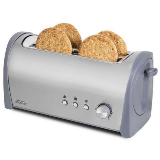 Tostapane con capacità per quattro fette biscottate. Include porta panini. 1400 W di potenza e 6 posizioni di tostatura, funzione di scongelamento e funzione di riscaldamento. Ampio vassoio raccogli briciole e foro per riporre i cavi. Cecotec Steel&Toast 2L.