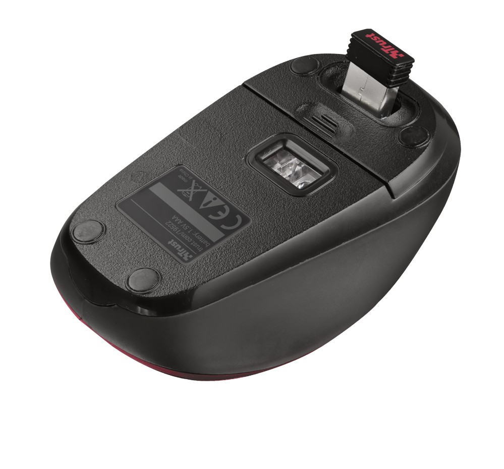 Trust 19522. Tecnologia di rilevamento del movimento: Ottico, Interfaccia dispositivo: RF Wireless, Risoluzione movimento: 1600 DPI, Tipo di pulsanti: Tasti premuti, Numero di tasti: 3, Tipo di scorimmento: Rotella. Alimentazione: Batterie. Colore del prodotto: Rosso