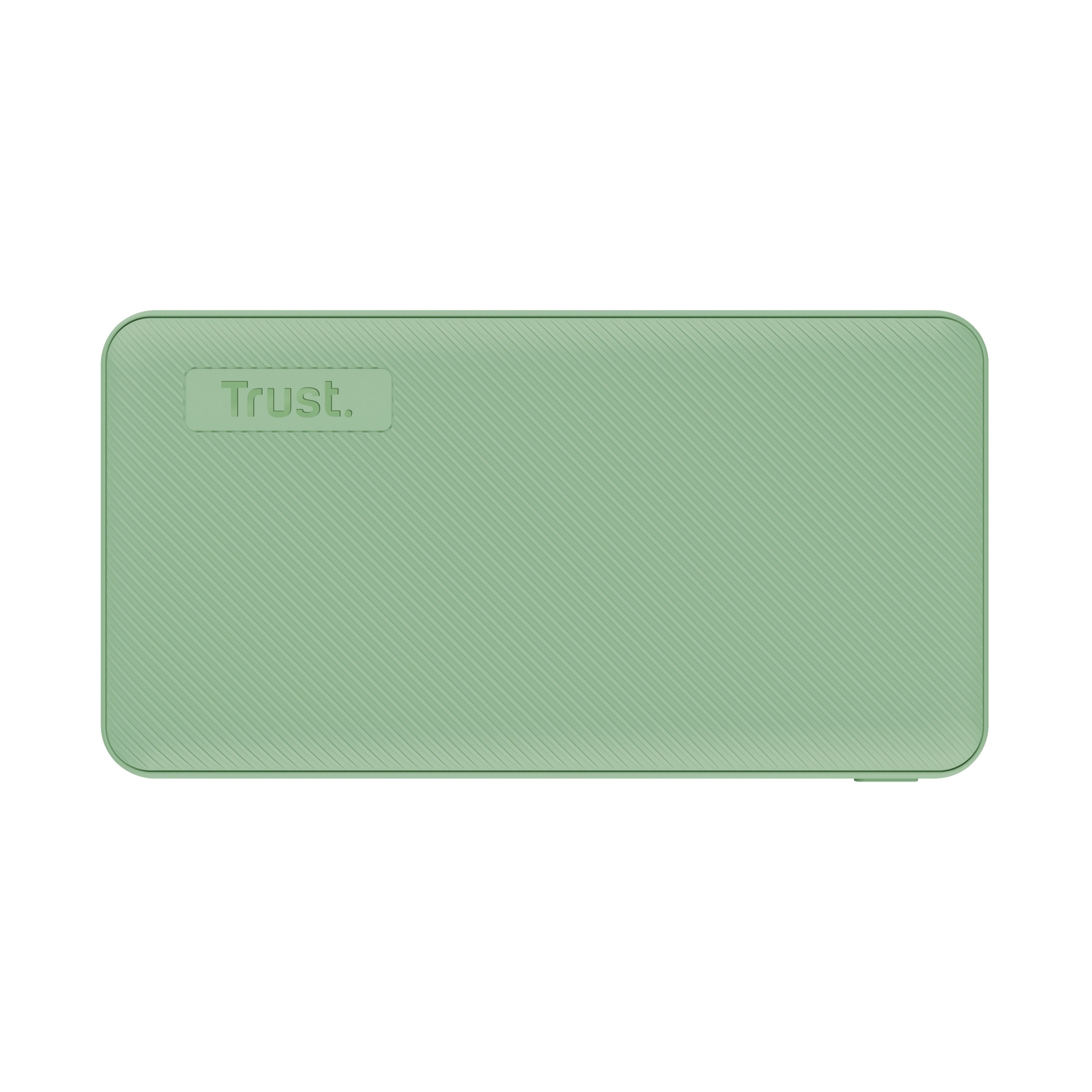 Trust 25029. Capacità della batteria: 10000 mAh, Tecnologia batteria: Ioni di Litio, Voltaggio della batteria: 3,7 V. Porte di uscita USB di tipo A: 2, Quantità di porte USB Tipo C: 1. Potenza di uscita totale: 15 W. Colore del prodotto: Verde