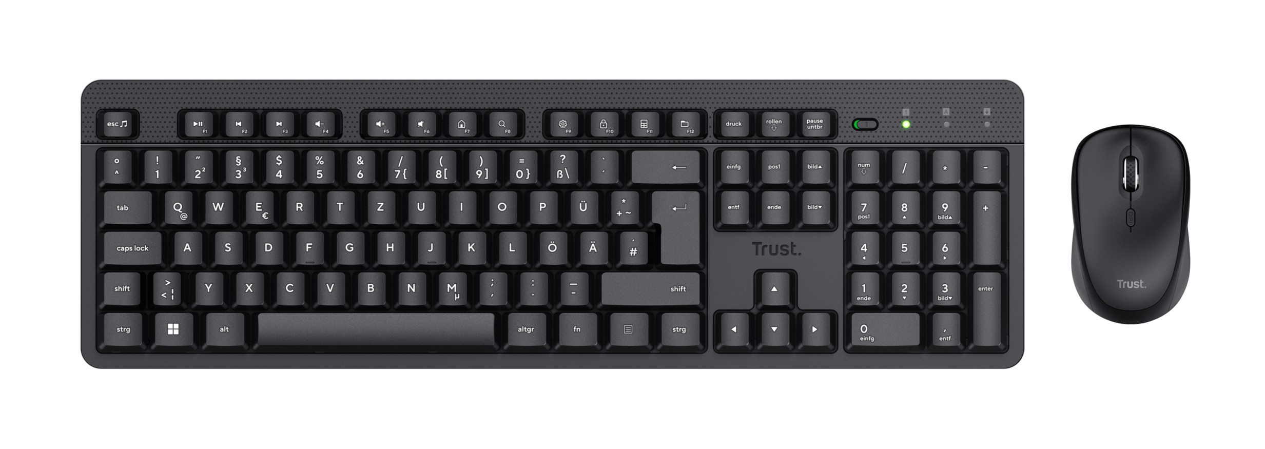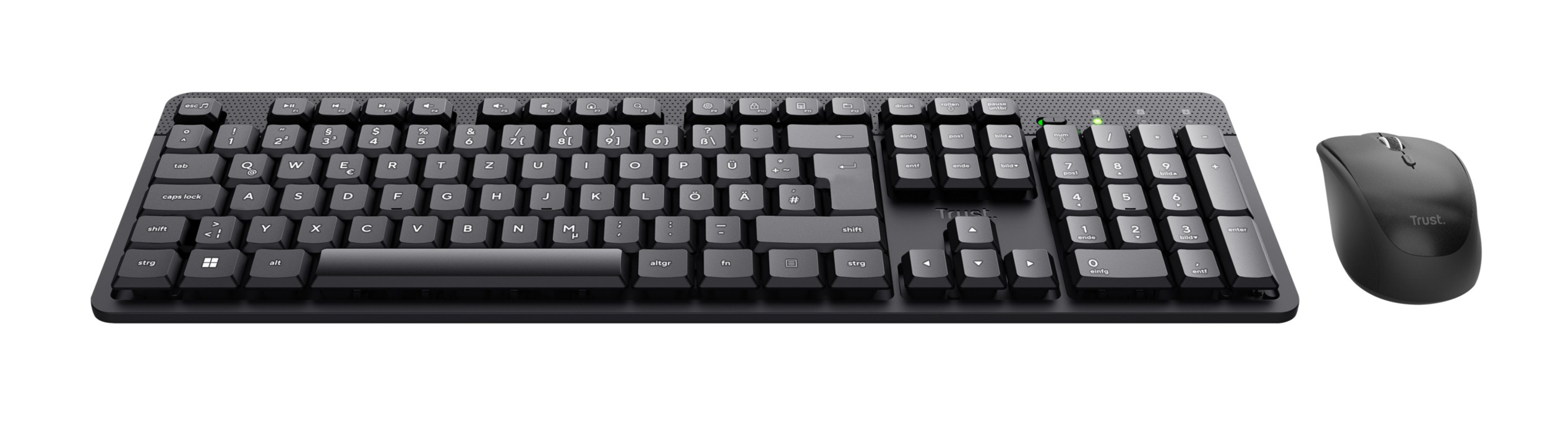 Trust TKM-360. Fattore di forma tastiera: Full-size (100%), Tecnologia di connessione: Wireless, Interfaccia dispositivo: RF Wireless, Interruttore a chiave per tastiera: Interruttore a chiave a membrana, Struttura tastiera: QWERTY, Utilizzo raccomandato: Ufficio. Colore del prodotto: Nero. Mouse incluso