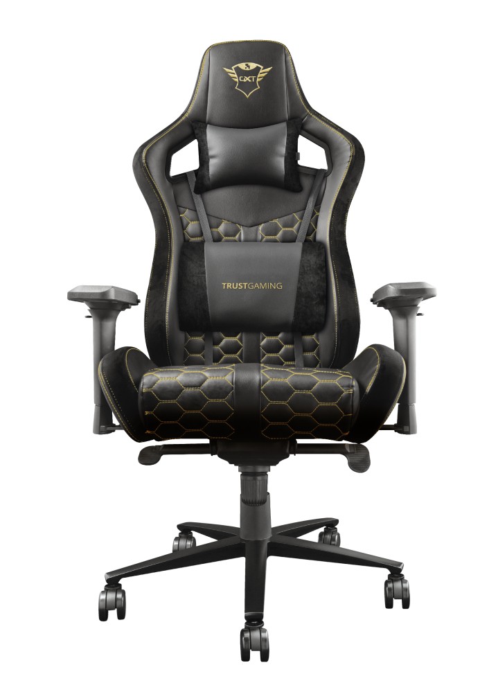 Una sedia da re I gamer lo sanno: giocare per ore e ore può causare affaticamento. Per questo ti serve una sedia che ti sostenga nelle avventure più intense e nelle battaglie più epiche. La sedia da gaming Trust GXT 712 Resto Pro, con schienale regolabile, cuscini rimovibili per collo e zona lombare, braccioli 4D e la capacità di reggere fino a 150 kg, ti farà sentire come un re. Ergonomica e spaziosa L'imbottitura ad alta densità del sedile e dello schienale correda il design ergonomico della sedia da gaming Rest Pro, mentre i cuscini in dotazione per collo e zona lombare evitano l'affaticamento e garantiscono grande comodità. Con il suo design spazioso, si adatta facilmente ad ogni gamer. Forte come te La Trust Rest Pro è un'eccellente sedia da gaming solida e robusta grazie al materiale resistente impiegato. La base della sedia è in metallo, che la rende molto robusta, e le solide ruote da 65 mm producono un fluido movimento scorrevole su qualsiasi superficie. Supporta fino a 150 kg e resiste persino agli schizzi. L'ultima cosa di cui ti dovrai preoccupare quando giochi è la sedia. L'eleganza dell'oro Chi vuole una sedia che sia noiosa? La Trust GXT 712 Resto Pro è fatta per i re del gaming. Per questo abbiamo decorato la pelle vegana in PU con eleganti cuciture dorate e dettagli che creano un effetto scamosciato, per rendere questa sedia all'altezza di ogni sala giochi.