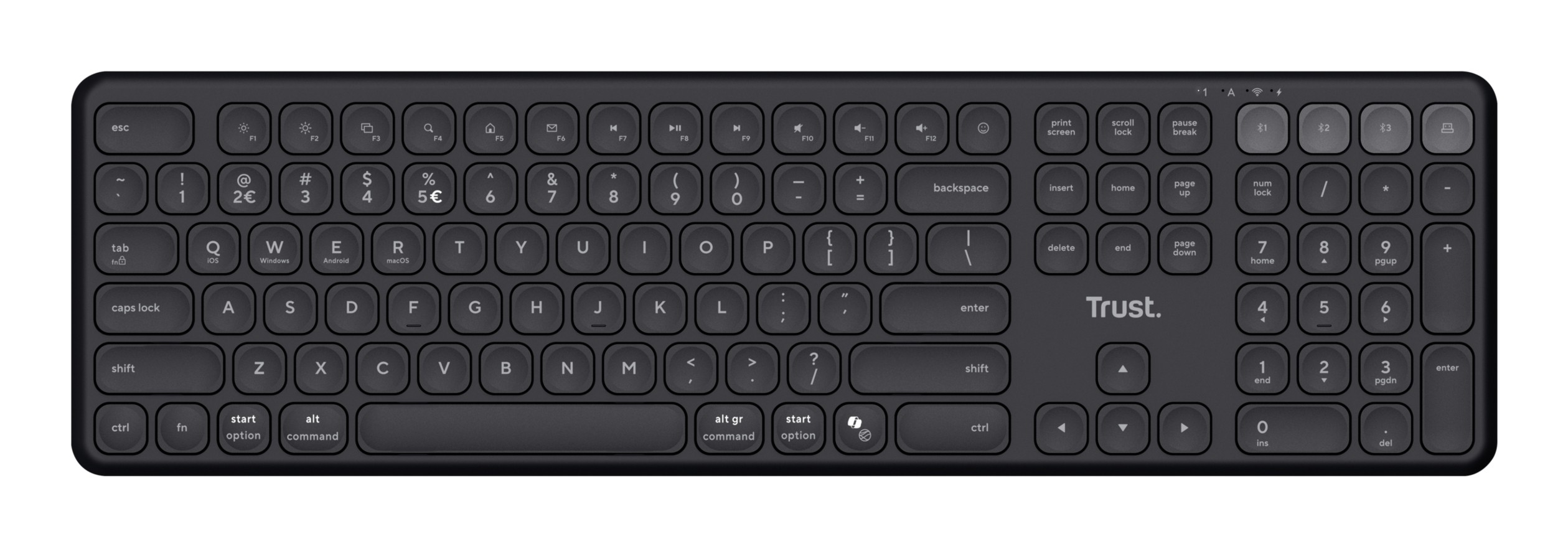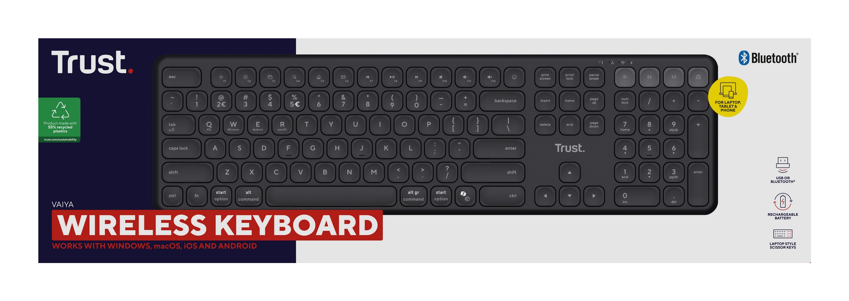 Trust Vaiya. Fattore di forma tastiera: Full-size (100%), Tecnologia di connessione: Con cavo e senza cavo, Interfaccia dispositivo: USB + RF Wireless + Bluetooth, Interruttore a chiave per tastiera: Tasto con meccanismo a forbici, Utilizzo raccomandato: Universale. Colore del prodotto: Nero