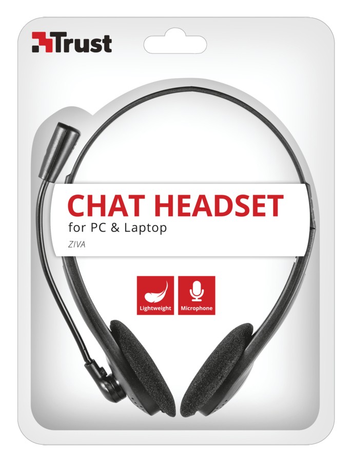 Trust ZIVA CHAT HEADSET. Tipo di prodotto: Auricolare. Tecnologia di connessione: Cablato. Utilizzo raccomandato: Musica e Chiamate. Frequenza cuffia: 70 - 20000 Hz. Lunghezza cavo: 1,8 m. Peso: 45 g. Colore del prodotto: Nero
