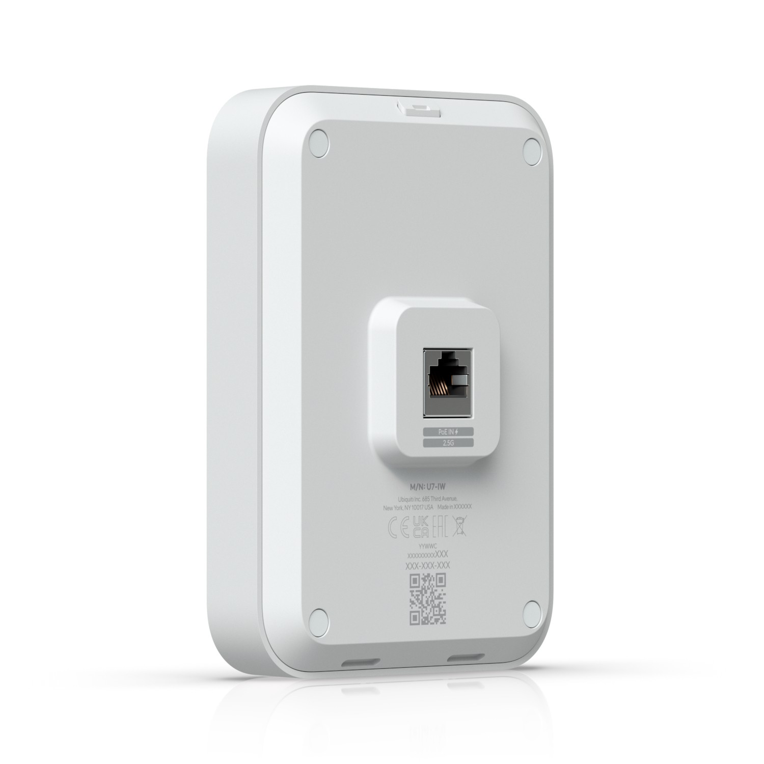 Ubiquiti U7 In-Wall. 2.4 GHz, 5 GHz, Velocità massima di trasferimento dati: 4300 Mbit/s. Algoritmi di sicurezza supportati: PPSK. Velocità trasferimento Ethernet LAN: 2500 Mbit/s. Supporto Power over Ethernet (PoE). Colore del prodotto: Bianco. Consumo energetico (max): 13 W