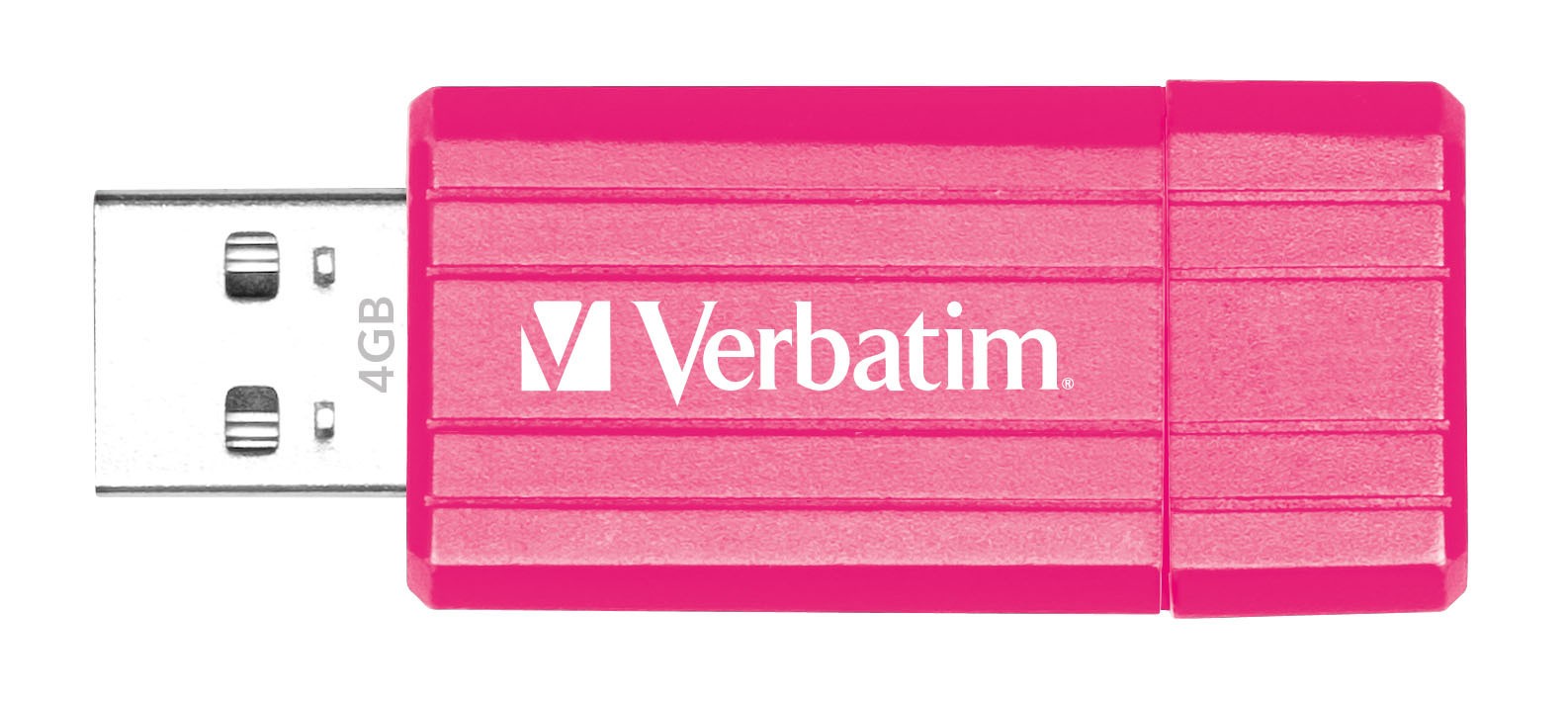 Verbatim PinStripe USB Drive 4GB - Hot Pink. Capacità: 4 GB, Versione USB: 2.0, Numero di grucce, Velocità di lettura: 10 MB/s, Velocità di scrittura: 4 MB/s. Peso: 8,6 g. Colore del prodotto: Rosa