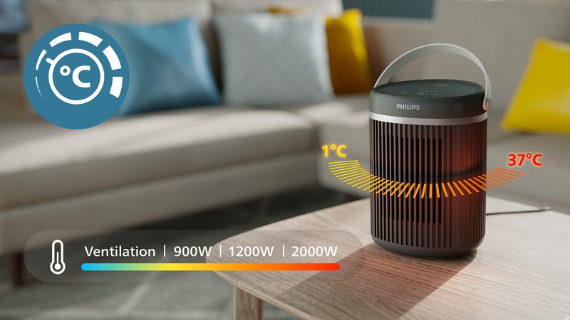 Imposta la temperatura desiderata (1-37 °C) e personalizza l'emissione di calore scegliendo tra i 3 livelli di riscaldamento (900W, 1200W e 2000W) (2). Nelle giornate più calde, la modalità ventilazione consente di godere di una leggera brezza per un ulteriore livello di comfort. Per la massima efficienza energetica e un riscaldamento ottimale dell'ambiente, attiva la modalità Auto+, la quale utilizza la tecnologia EcoAI implementata sul risparmio energetico.