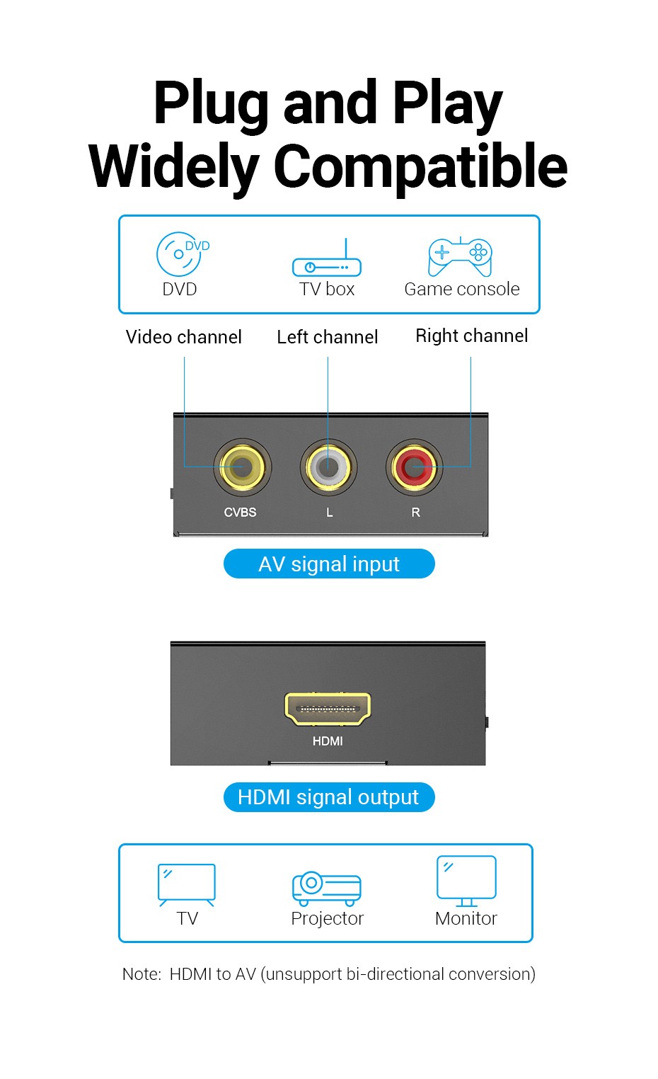 Vention AEFB0. Tipo di convertitore: Convertitore video attivo, Colore del prodotto: Nero, Materiale della scocca: Metallo. Risoluzione massima video: 1920 x 1080 Pixel, Modalità video supportate: 1080p, Formato video analogico: NTSC, PAL. Interfaccia host: HDMI, interfaccia output: 3 x RCA. Tensione di esercizio: 5 V, Corrente operativa: 1 A. Larghezza: 56 mm, Profondità: 60 mm, Altezza: 22 mm
