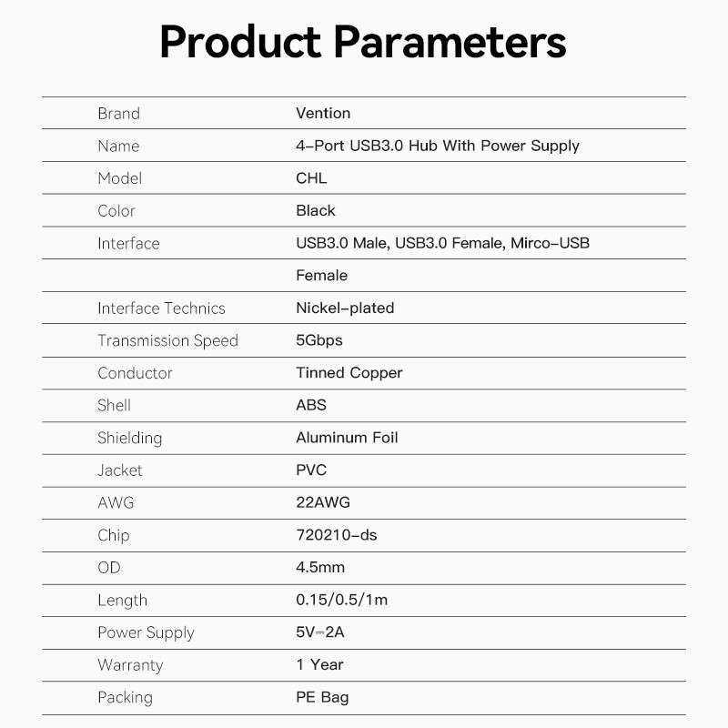 Vention CHLBD, USB 3.2 Gen 1 (3.1 Gen 1) Type-A, USB 3.2 Gen 1 (3.1 Gen 1) Type-A, 5000 Mbit/s, Nero, Acrilonitrile butadiene stirene (ABS), Cloruro di polivinile (PVC), Cloruro di polivinile (PVC)