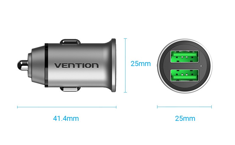 Vention FFAH0. Tipo di caricatore: Auto, Tipologia alimentazione: Accendisigari, Compatibilità caricatore: Universale. Voltaggio di ingresso: 12 - 24 V, Tensione di uscita (max): 12 V. Quantità porte USB 2.0: 2, Ricarica rapida, Funzionalità di protezione dell'alimentazione: Sovracorrente, Sovralimentazione, Sovraccarico, Cortocircuito. Colore del prodotto: Grigio