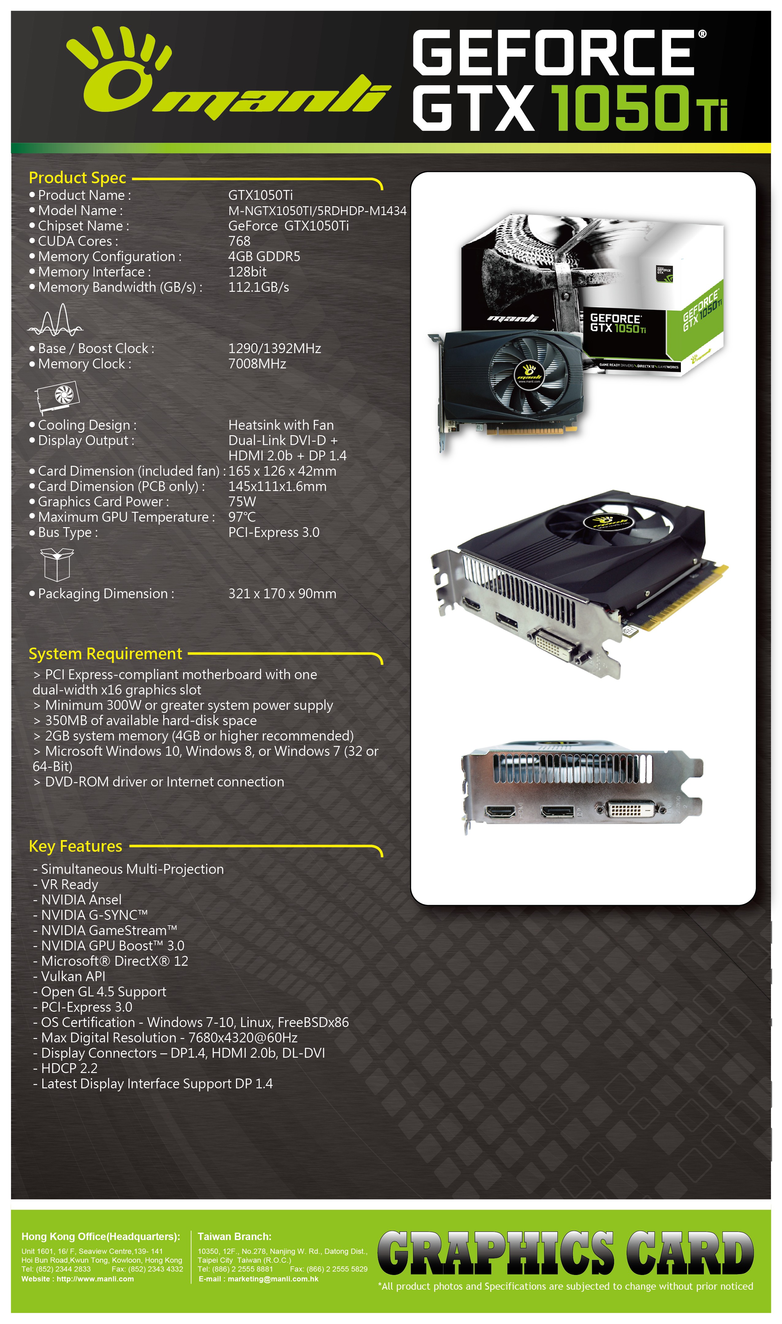 Manli M-NGTX1050TI/5RDHDP-M1434, GeForce GTX 1050 Ti, 4 GB, GDDR5, 128 bit, 7680 x 4320 Pixel, PCI Express x16 3.0
