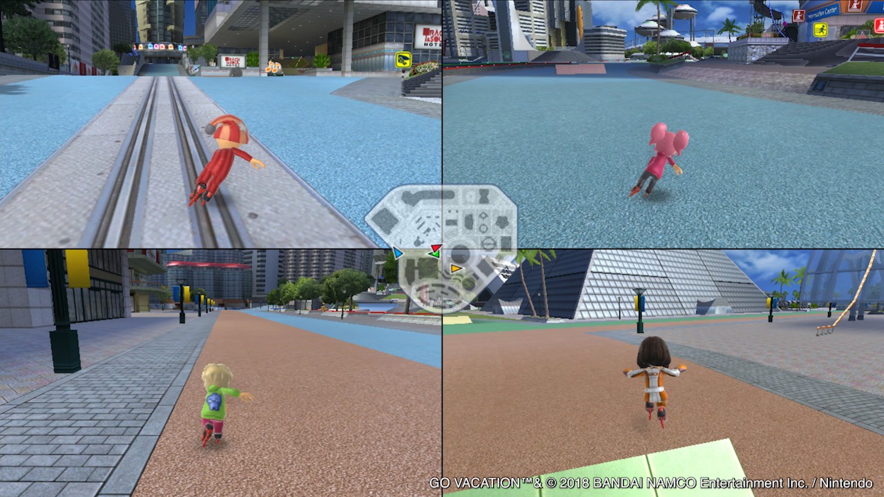 Riunisci gli amici e vai in vacanza! Più di 50 attività! Con più di 50 attività cooperative e competitive, in GO VACATION il divertimento non finisce mai! Divertiti con attività come immersioni, equitazione e pesca al mare! Lanciati col paracadute, insegui le onde più grandi o sfoggia la tua bravura con lo skateboard in una varietà di sport estremi! Lotta per la vittoria in tante attività divertenti, come lo sci, il beach volley, il minigolf e molto altro! Modi di giocare GO VACATION non offre solo molte attività, ma anche tanti modi di divertirsi con esse con amici e familiari! Condividi un Joy-Con con un amico e giocate quando e dove volete! Fino a quattro giocatori possono divertirsi insieme nella modalità a schermo condiviso* o in wireless locale**. Prova una selezione di attività come il rafting, il minigolf e le battaglie di palle di neve con i comandi di movimento. Puoi usarli anche per guidare ATV, macchine sportive e altri veicoli! O, se preferisci, utilizza il volante Joy-Con (venduto separatamente). Isola Kawawii Esplora l'Isola Kawawii e scopri i panorami e i suoni che ha da offrire. Ci sono quattro resort da visitare, ognuno con attività uniche. Resort mare Quest'area costiera ospita tanti tipi di attività estive, come le immersioni, il beach volley, la pesca al mare e altre. Puoi persino raggiungere l'Isola Coconore, un luogo speciale riservato ai surfisti! Resort monti Kawawii Questa zona collinosa è perfetta per le attività all'aperto come il kayak, l'equitazione, il rafting, la pesca in montagna e altro ancora. Resort neve Kawawii I fan dei pendii adoreranno questa montagna dalla cima innevata, che offre attività invernali come le battaglie di palle di neve, la costruzione di pupazzi di neve, le gare di motoslitta e il salto con gli sci. Resort città Kawawii I tipi di città si sentiranno subito a loro agio in questa vibrante metropoli, con attività come le gare di macchine, il deltaplano, il minigolf, l'hockey da tavolo e altro ancora. Esplora! Recati al resort che preferisci e inizia a visitarlo usando i vari mezzi a tua disposizione: dai cavalli ai buggy, dalle motoslitte ai pattini. Fino a tre giocatori possono unirsi a te, ognuno con un suo veicolo! Il tuo paradiso personale Ci sono tanti modi per rilassarsi sull'Isola Kawawii! Personalizza il tuo look Prima di arrivare a Kawawii Island, potrai creare il tuo personaggio partendo da zero o importando un Mii. Esplorando l'isola sbloccherai nuovi costumi con cui personalizzare il tuo look. Una casa lontano da casa Nell'area residenziale dell'isola avrai accesso a un'abitazione tutta tua, che potrai personalizzare scegliendo il tipo, il colore, le dimensioni e la posizione dei mobili. Anche i tuoi amici e familiari possono stabilirsi sull'isola! Vai alla caccia di sorprese nascoste Esplora liberamente l'isola per scoprirne i segreti insieme al tuo cane da compagnia o con gli amici nella modalità multiplayer in locale. Scova scrigni e oggetti nascosti, trova nuovi minigiochi o rilassati con un bel gelato! Qualcosa di nuovo ogni giorno! Nuovi regali e sfide appaiono quotidianamente sull'Isola Kawawii, quindi visitala spesso! Supera delle speciali sfide giornaliere per salire di livello o aiuta altri a farlo con gli esercizi di orienteering di gruppo. Cattura momenti memorabili! Crea dei ricordi delle tue vacanze scattando foto del tuo personaggio, dei tuoi amici e del tuo cane! Gli amanti della natura potranno persino dedicarsi a riempire uno zoo fotografico con le più di 40 specie animali che abitano l'Isola Kawawii. Riuscirai a trovarle tutte?