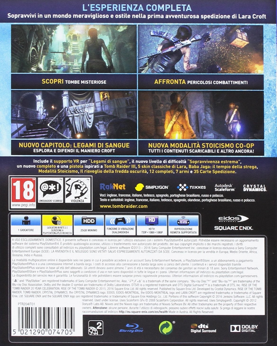 L'evoluzione di Tomb Raider Unisciti a Lara Croft per continuare l'epica storia delle sue origini e parti per la sua prima missione nelle tombe, alla ricerca dei segreti dell'immortalità. Sopravvivi a un ambiente ostile cercando gli strumenti per creare frecce nuove e più letali. Usa le abilità di Lara per trovare e cacciare gli animali, per poi fabbricare archi e indumenti speciali. Usa la furtività e l'agilità per abbattere i nemici e avanzare in un territorio ostile, scalando rupi vertiginose, saltando da un bordo all'altro e usando il rampino di Lara per raggiungere altezze incredibili e ammirare panorami dettagliatissimi. PlayStation VR Legami di sangue Vivi il gioco tramite gli occhi di Lara ed esplora il Maniero Croft nel nuovissimo capitolo Legami di sangue, ottimizzato per PlayStation VR.