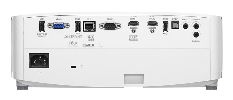 Optoma UHD55. Tecnologia di proiezione: DLP, Risoluzione nativa del proiettore: 2160p (3840x2160), Rapporto di contrasto: 1200000:1. Tipo di sorgente luminosa: Lampada, Durata della sorgente luminosa: 15000 h, Luminosità della sorgente luminosa: 3600 lm. Lunghezza focale: 12.81 - 16.74 mm, Range di apertura (F-F): 1,94 - 2,23, Tipo di zoom: Manuale. Tipo interfaccia seriale: RS-232. Emissione acustica: 26 dB, Tecnologia High Dynamic Range (HDR): High Dynamic Range 10 (HDR10), Hybrid Log-Gamma (HLG)