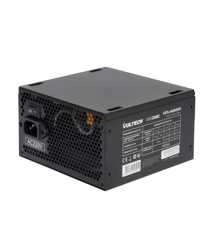 Alimentatore VulTech® VPS-A650R Serie Essence da 650W. Indicato per PC con configurazioni impostate per un uso domestico o da ufficio. Supporta le normali attività della macchina e garantisce un alto indice di affidabilità nel tempo.