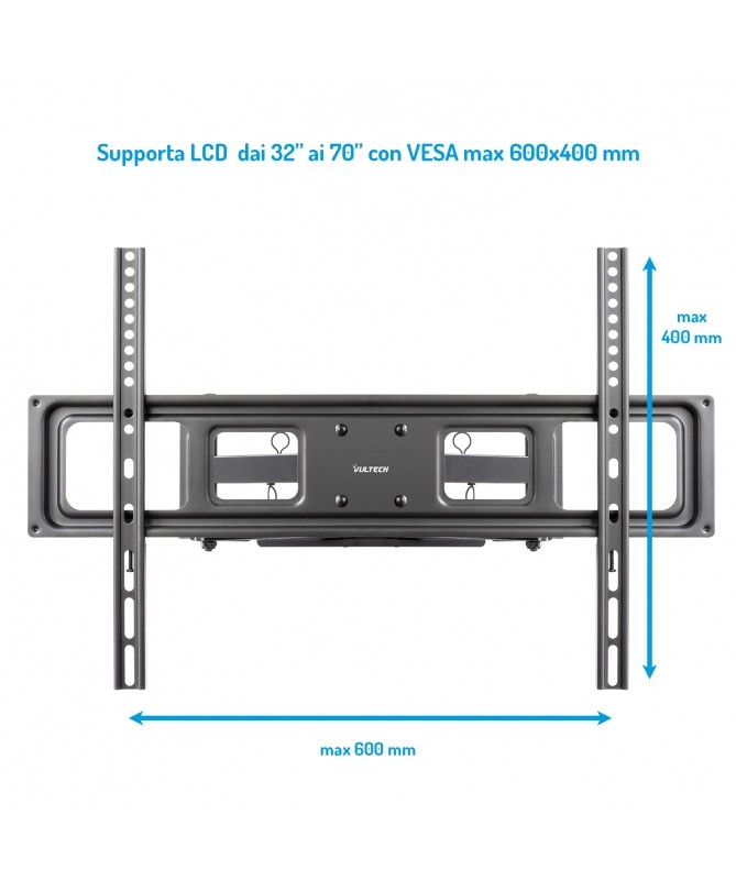 Vultech Braccio Staffa Per Tv - Da 32" A 70" Con Snodo. Peso massimo (capacità): 40 kg, Capienza minima dimensioni dello schermo: 81,3 cm (32"), Capienza massima dimensioni dello schermo: 177,8 cm (70"), Compatibilità interfaccia di montaggio (min): 200 x 200 mm, Compatibilità interfaccia di montaggio (max): 600 x 400 mm. Inclinazione: -15 - 5°, Angolo di rotazione: -60 - 60°, Angolo di rotazione: 6°, Distanza dalla parete (min): 5,3 cm, Distanza dal muro (massima): 46,4 cm. Colore del prodotto: Nero