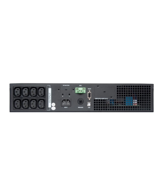 Uscite: 8 prese IEC C13 e contatto EPO (Emergengy Power Off) in grado di facilitare lo spegnimento immediato del gruppo in caso di emergenze.