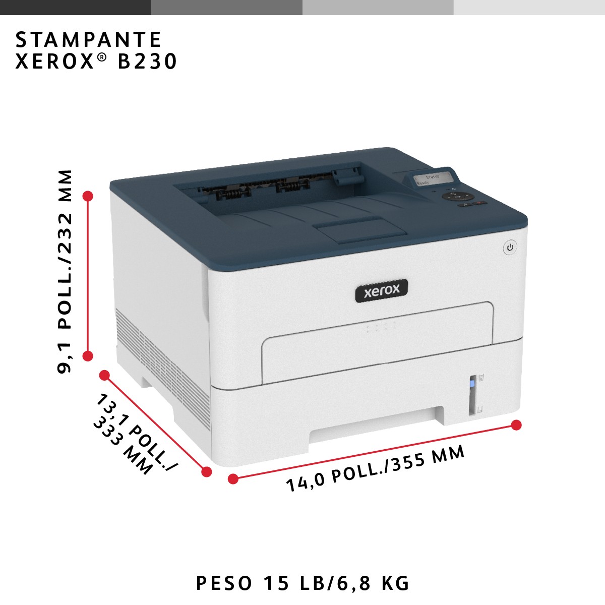 Xerox B230 A4 34 ppm Stampante fronte/retro wireless PCL5e/6 2 vassoi Totale 251 fogli, Laser, 2400 x 2400 DPI, A4, 34 ppm, Stampa fronte/retro, Blu, Bianco