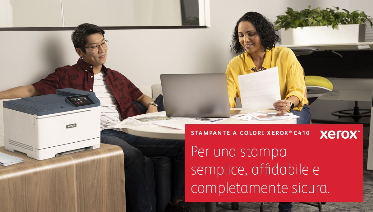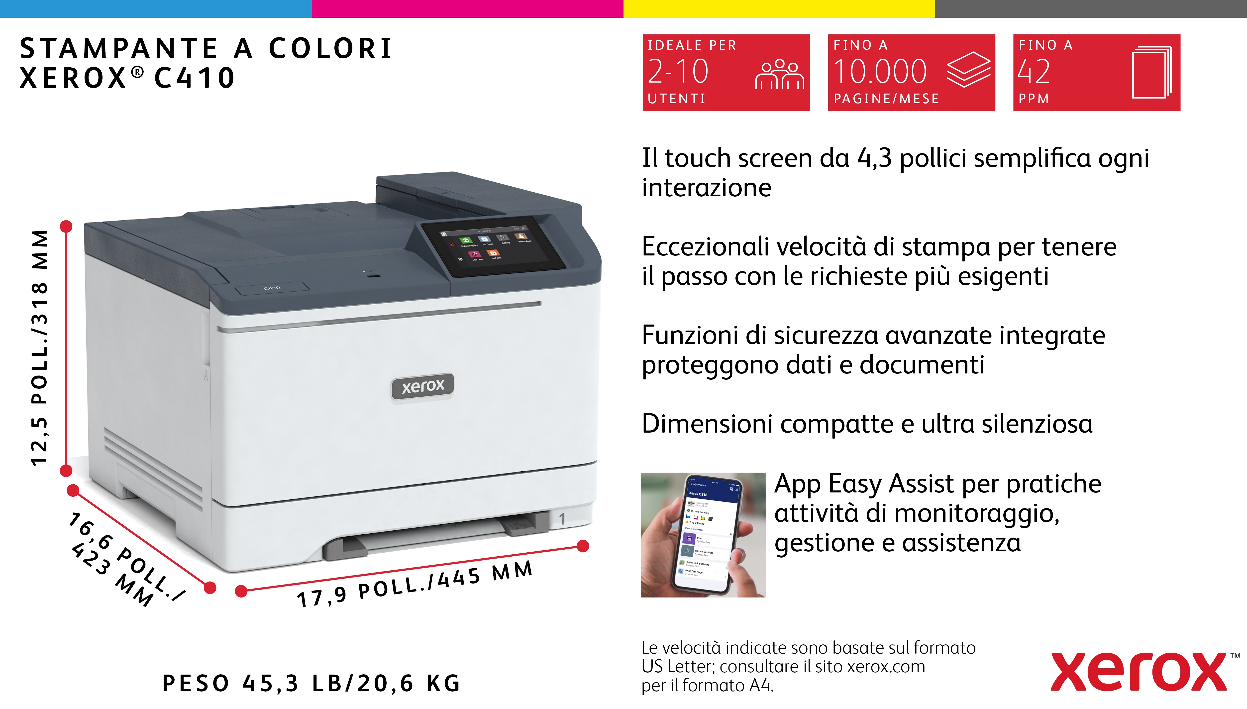 Semplice, affidabile e sicura. Vuoi eliminare i problemi e lavorare in modo produttivo? La stampante a colori Xerox® C410 ti offre tutto ciò di cui hai bisogno e nulla di superfluo per aiutarti a fare di più: funzionalità appropriata, rapidità di stampa, produzione a colori di alta qualità e Wi-Fi opzionale. Si installa in un attimo. Perfetta per team di piccole e medie dimensioni che hanno bisogno di stampa affidabile, la stampante C410 è subito pronta all’uso. L’app Xerox® Easy Assist offre una guida alla configurazione del Wi-Fi direttamente dal tuo cellulare. Sarai quindi in grado di concentrarti sul tuo lavoro e di stampare nel giro di pochi minuti invece che dopo ore, con un bisogno limitato di assistenza IT.